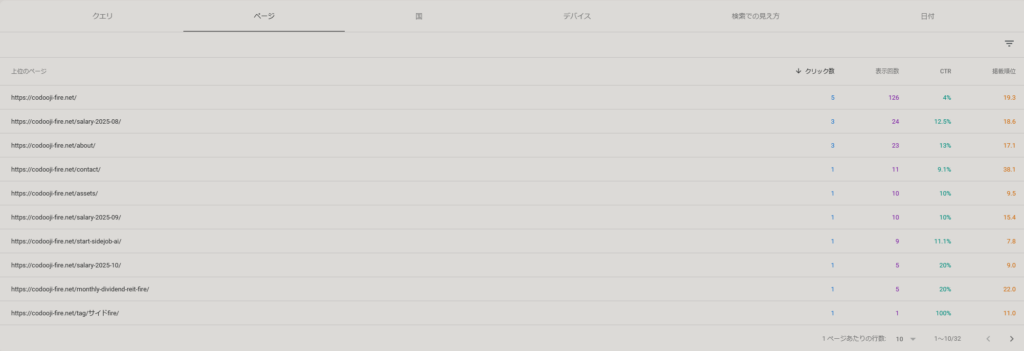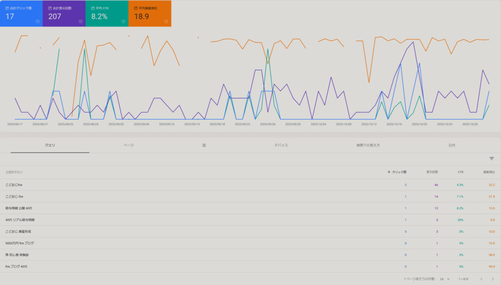 検索クエリを確認すると、上位には「こどおじ fire」「給与明細 公開 40代」など、生活のリアルと FIRE を結びつけた検索ワードが並びました。この結果を見たとき、正直驚きました。