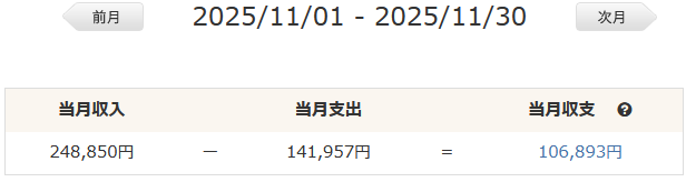 今月の収支は、収入248,850円、支出141,957円、収支は+106,893円でした。