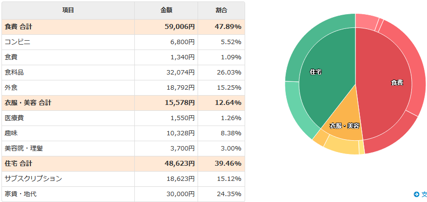 まず目立つのは、衣服・美容カテゴリの支出がかなり少なかったことです。