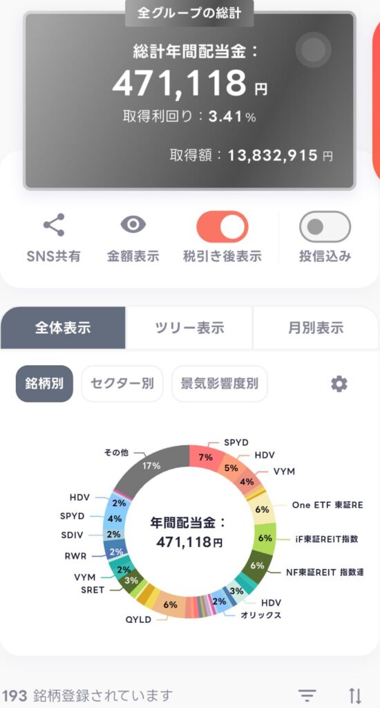 現在の年間配当金は471,118円(税引後)、取得利回りは3.41%(税引後)です。