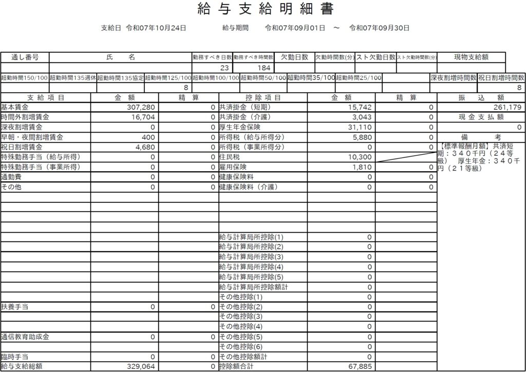 今月(2025年10月)の給与明細をまとめると、次のとおりです。